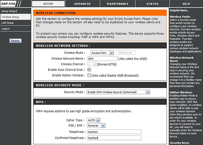 Зайдите на вкладку SETUP (сверху) - Wireless Setup (слева).