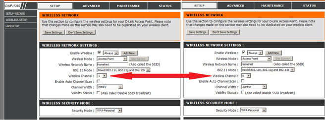 3. В разделе SETUP => WIRELESS SETUP настраиваем все параметры одинаково за исключением номера канала, на котором должны работать точки доступа. Это необходимо, чтобы рабочие частоты точек доступа не пересекались и точки доступа не мешали друг другу работать.
