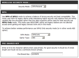 4. Параметры безопасности WiFi так же должны быть одинаковы. Для максимальной производительности стандарта 802.11n рекомендуется в параметрах безопасности выбрать в поле «WPA Mode»=«WPA2 only», а в поле «Cipher Type»=«AES». Пароль должен быть минимум 8 символов и рекомендуется чтобы были одновременно большие и маленькие буквы и цифры.