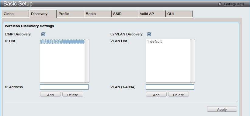 Вкладка WLAN, меню Administration → Basic Setup, вкладка Discovery.