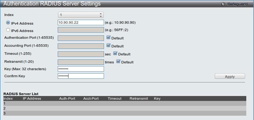 После нажатия Apply появится строка в Radius Server List: