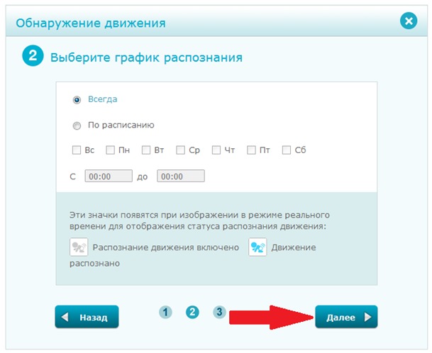 Шаг 6: Установите расписание включения обнаружения движения. Нажмите Далее, чтобы продолжить.