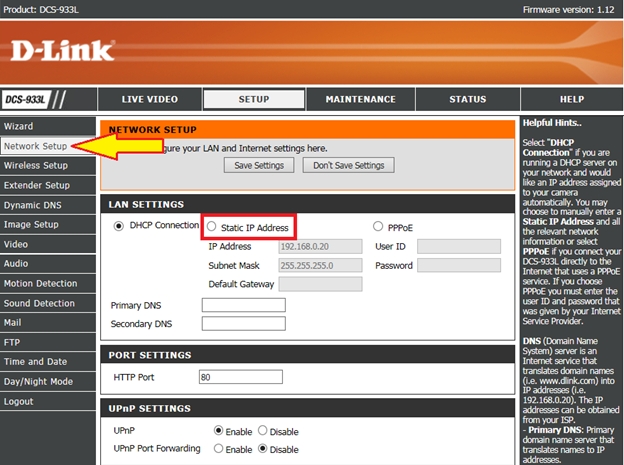 Шаг 4: В меню слева выберите Network Setup (Настройка сети) и в разделе LAN Settings установите переключатель в положение Static IP Address (Статический IP-адрес).