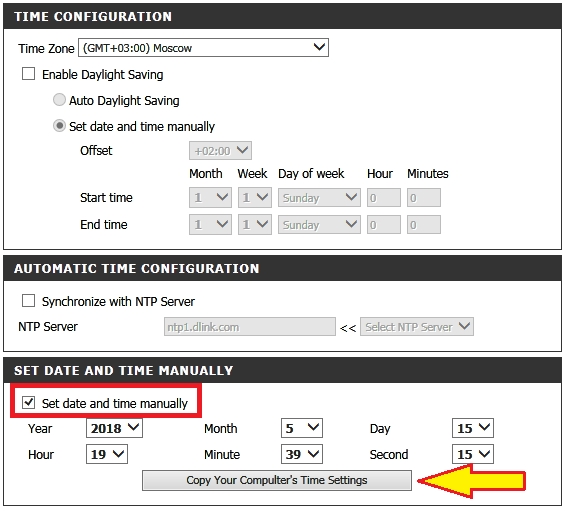 Шаг 6: Вы можете установить корректное время на камере, скопировав его с Вашего компьютера. Для этого установите флажок в поле Set date and time manually (Установить дату и время вручную) и нажмите кнопку Copy Your Computer’s Time Settings.