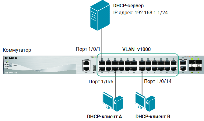 Необходимо чтобы DHCP-клиент А, подключенный к порту 6 коммутатора, получил IP-адрес — 192.168.1.6/24, DHCP-клиент В — любой свободный IP-адрес из диапазона 192.168.1.100–150.