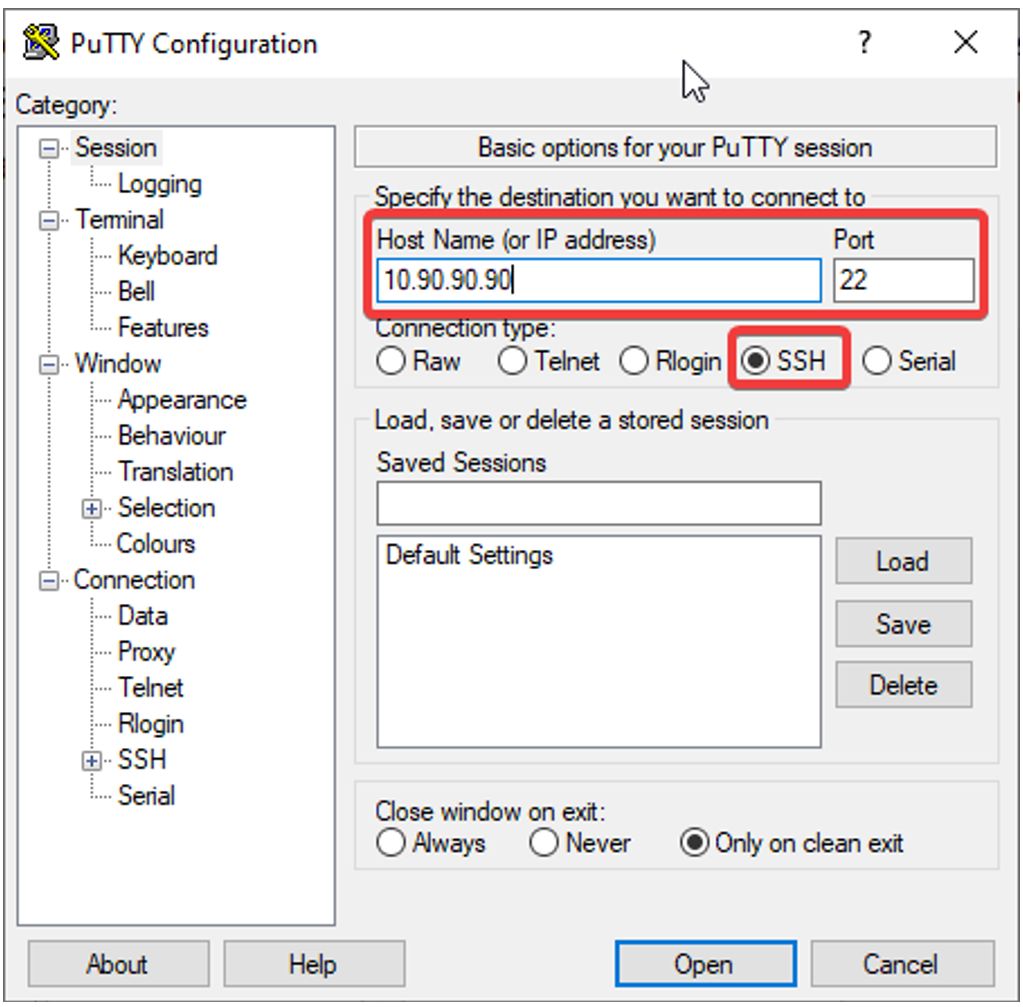 3. На экране появится панель входа приложения Putty. В строке Connection type выберите SSH, в строке Host Name (or IP address) введите 90.90.90, в поле Port22. Нажмите кнопку Open.
