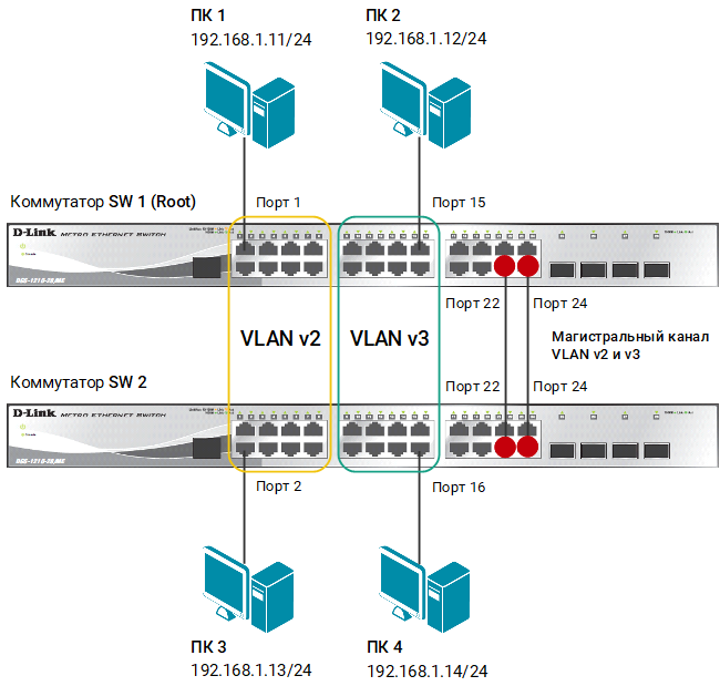 Каждая VLAN привязывается к одной копии связующего дерева. Порты 22 и 24 являются маркированными портами обеих VLAN. Порт 22 используется в качестве активного канала связи для VLAN v2, а порт 24 — для VLAN v3. Так как для каждой VLAN будет построена своя собственная активная топология связующего дерева, то кадры VLAN v2 и VLAN v3 будут передаваться по разным маршрутам (через порты 22 и 24 соответственно), благодаря чему будет обеспечена балансировка нагрузки. В случае если один из каналов связи выйдет из строя, трафик VLAN v2 и VLAN v3 будет передаваться по одному оставшемуся каналу.
