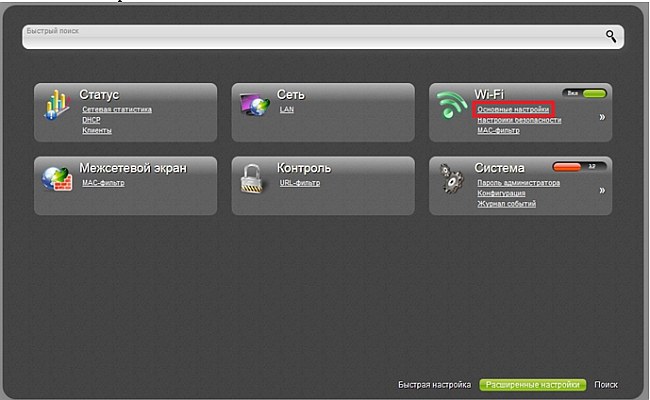 Для настройки параметров wi-fi сети зайдите в «Расширенные настройки» и выберете «Основные настройки» в меню Wi-Fi.