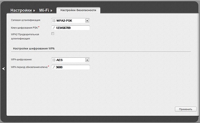 Здесь необходимо выставить такие же параметры сетевой аутентификации и шифрования как и у сети которую вы расширяете. После нажать Применить.