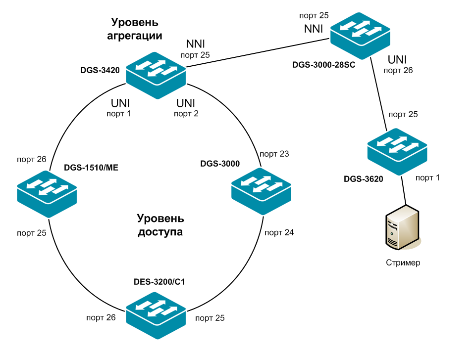 В данном примере реализована схема "VLAN на коммутатор". С целью обеспечения резервирования линий связи коммутаторы уровня доступа подключены кольцом к коммутатору уровня агрегации. Для предоставления услуги IPTV на коммутаторах уровня доступа используется функционал ISM VLAN. Задачей является добавление внешнего тега (при помощи функционала Q-in-Q) для всех клиентских VLAN, при этом ISM VLAN и управляющий VLAN должны передаваться с одним тегом 802.1Q . Добавление второго тега осуществляется на уровне агрегации.