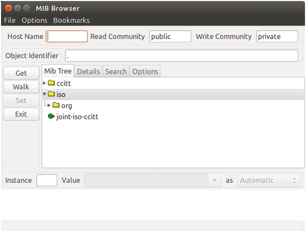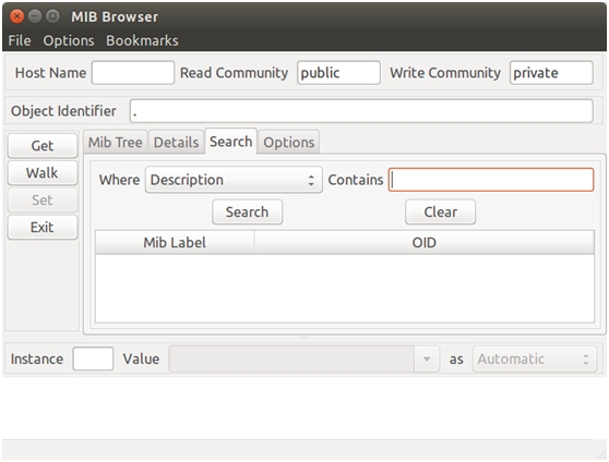 Для работы с MIB-файлами в Mbrowse под операционной системой Ubuntu требуется сначала скопировать файлы из распакованной папки с MIB файлами в каталог /root/.snmp/mibs. Далее запустить mbrowse. После этого появится окно программы показанное на рисунке 1.