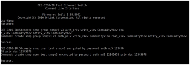 create snmp user test snmpv3 encrypted by_password auth md5 12345678 priv des 12345678