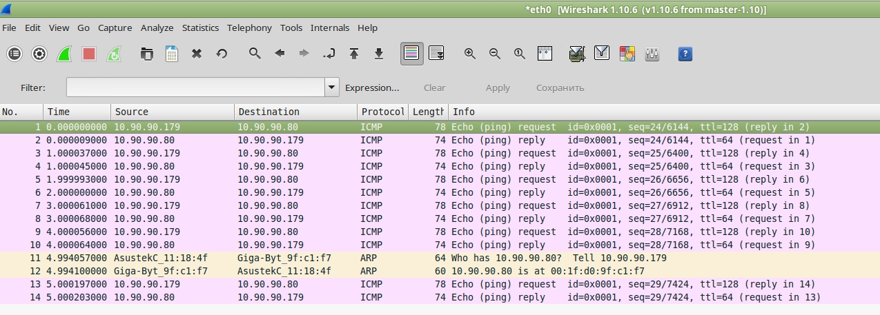 Для того, чтобы убедиться, что мы видим трафик от PC2, нужно запустить Ping PC1→PC2. В окне Wireshark мы должны увидеть Ping запросы к PC2 (это TX трафик относительно 17-го порта коммутатора) и Ping ответы от PC2 (это RX трафик относительно 17-го порта коммутатора) (Рисунок 2)