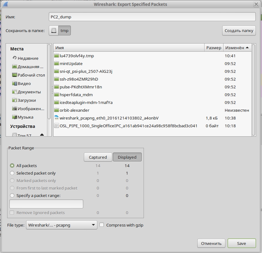 Далее для того, чтобы сохранить собранный дамп трафика, нужно остановить сбор трафика, затем выбрать File - Export Specified Packets... , после чего появится новое окно (Рисунок 3):