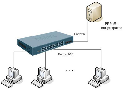 PPPoE - концентратор подключён к порту 26 коммутатора DES-3526, клиенты подключены к портам 1-25, MAC-адрес концентратора - 00-13-5F-AA-BB-CC.