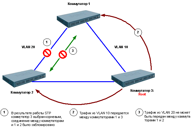 Если коммутатор 3 будет выбран корневым коммутатором для STP, то соединение между коммутаторами 1 и 2 будет заблокировано. В этом случае трафик из VLAN 20 не сможет передаваться по сети. Эта проблема возникает потому, что коммутаторы рассматривают VLAN 10 и 20 как независимые сети, в то время как протокол STP рассматривает топологию сети как одну целую сеть.