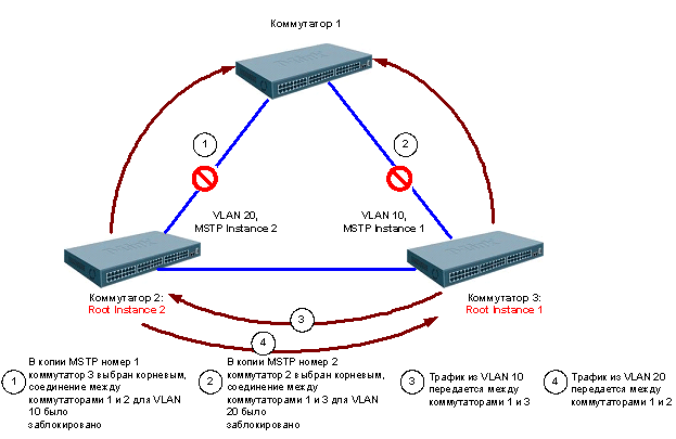 - Если назначить VLAN 10 на копию MSTP под номером 1, а VLAN 20 сопоставить с копией 2.